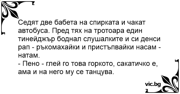 Седят две бабета на спирката и чакат автобуса. Пред тях на тротоара един тинейджър боднал слушалките и си денси рап - ръкомахайки и пристъпвайки насам - натам.