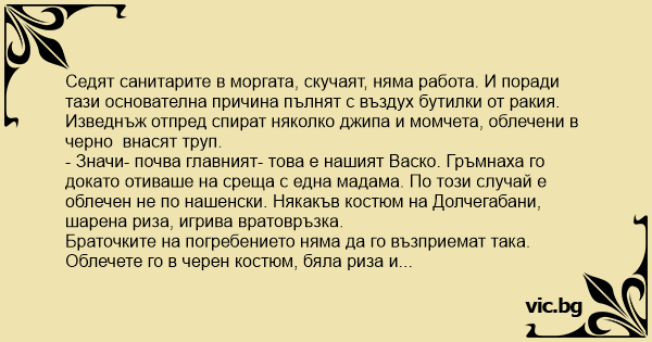 - Значи- почва главният- това е нашият Васко. Гръмнаха го докато отиваше на среща с една мадама. По този случай е облечен не по нашенски. Някакъв костюм на Долчегабани, шарена риза, игрива вратовръзка.