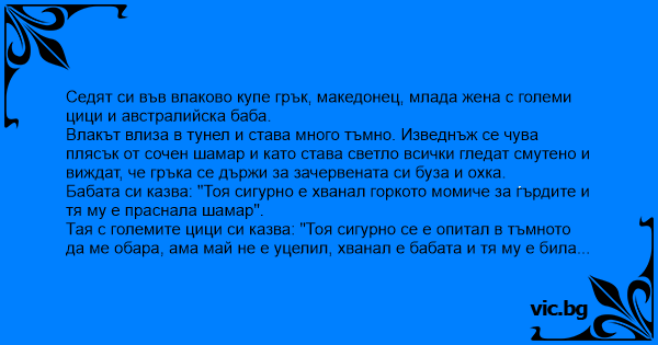 Тая с големите цици си казва: "Тоя сигурно се е опитал в тъмното да ме обара, ама май не е уцелил, хванал е бабата и тя му е била шамар".