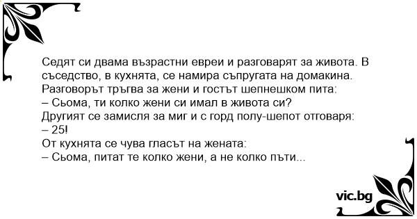 Сидять два старих єврея, розмовляють за життя. На кухні порається жінка одного з них. Починають розмовляти за жінок, один стишено по-дружньому запитує: — Сьомо, а скільки жінок ти мав за життя?...