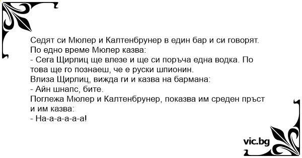 - Сега Щирлиц ще влезе и ще си поръча една водка. По това ще го познаеш, че е руски шпионин.
