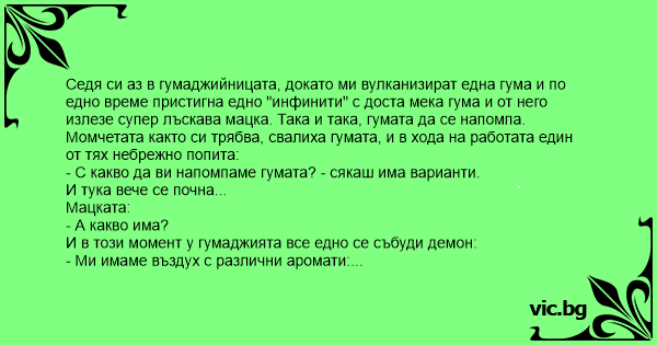 Седя си аз в гумаджийницата, докато ми вулканизират една гума и по едно време пристигна едно "инфинити" с доста мека гума и от него излезе супер лъскава мацка. Така и така, гумата да се напомпа.
