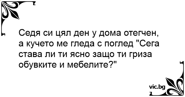 Седя си цял ден у дома отегчен, а кучето ме гледа с поглед "Сега става ли ти ясно защо ти гриза обувките и мебелите?"