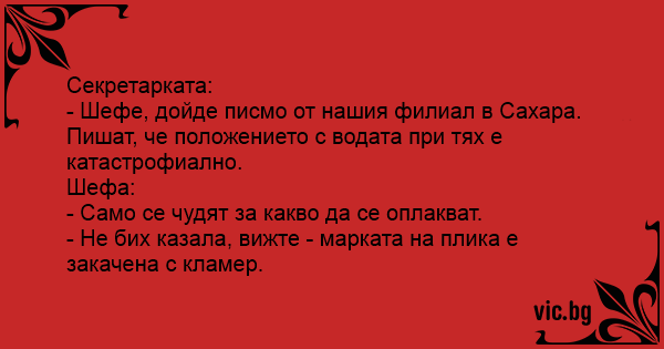 - Шефе, дойде писмо от нашия филиал в Сахара. Пишат, че положението с водата при тях е катастрофиално.