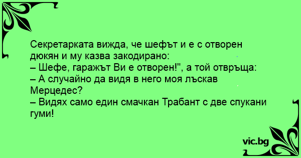 – Шефе, гаражът Ви е отворен!", а той отвръща: