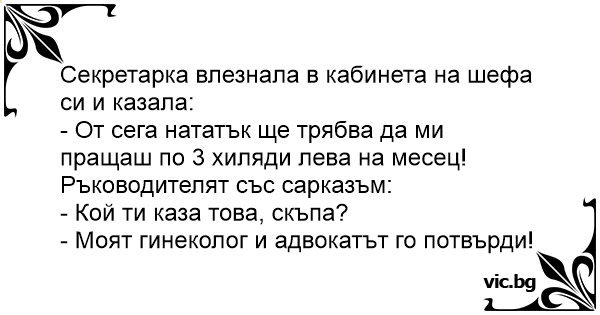 Chiste de la secretaria y el lio con el jefe Влиза секретарка при шефа и казва: "Wer", tobt der Chef zu seiner Sekretärin, "hat Ihnen eigentlich gesagt, dass Sie hier den ganzen Tag faulenzen können, nur weil ich sie ein paarmal geküsst habe?" Орет новый русский на секретаршу: Der Chef ist sauer auf seine Sekretärin: "Wer hat Ihnen eigentlich gesagt, daß Sie hier im Büro nur faul herumhängen können, bloß weil ich Sie auf dem letzten Betriebsfest vernascht habe?" "Mein Anwalt!" Direktören till sekreteraren: - Vem har sagt att ni kan bära er åt hur som helst bara för att jag har kysst er ett par gånger? - Min advokat! Секретарката влегува кај шефот и вели: - Од овој момент платата ќе ми биде 1000 евра и ќе имам 4 слободни денови во неделата... Шефот со сарказам: - А кој ти го рече тоа мила? - Мојот гинеколог, а... El jefe le dice a la secretaria: - Oye, ¿pero a ti quién te ha dicho que puedes pasarte dando vueltas todo el día sin trabajar, sólo porque nos acostamos una noche? - Mi abogado...Cupones y... Jefe: ¿ Quién te ha dicho que puedes pasarte dando vueltas sin trabajar todo El día, sólo porque tuvimos un rollo? Secretaria: Mi abogado... Firmos savininkas rėkia ant sekretorės: - Tu ką čia dabar išsigalvoji? Manai, kad jei porą kartų tave nusivedžiau į kavinę ir į lovą pasiguldžiau, tai gali nedirbti?! - Taip! - atsako sekretorė. -... Priekšnieks brēc uz sekretāri: "Ko tu iedomājies - tas, ka es tevi pāris reizes aizvedu uz krogu un dalīju ar tevi gultu - tev dod tiesības vairāk nestrādāt???" "Jā," atbild sekretāre. "Kas ta tev...