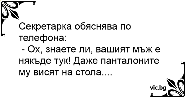 - Ох, знаете ли, вашият мъж е някъде тук! Даже панталоните му висят на стола....