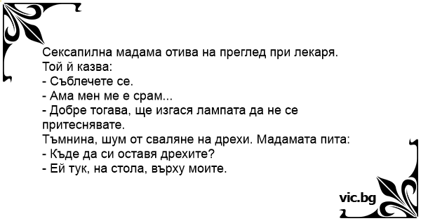 O tinara fermecatoare de duce la doctor pentru un Consult periodic. Doctorul ii cere sa se dezbrace si Sa-si puna hainele in cuierul alaturat. - Chilotii unde sa mi-i pun, domnule doctor? - Pe...