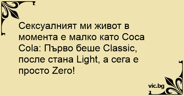 Сексуалният ми живот в момента е малко като Coca Cola: Първо беше Classic, после стана Light, а сега е просто Zero!