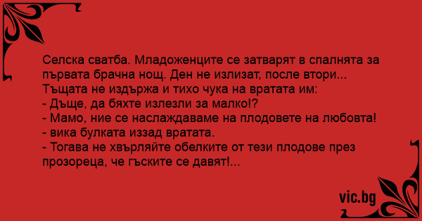 Селска сватба. Младоженците се затварят в спалнята за първата брачна нощ. Ден не излизат, после втори... Тъщата не издържа и тихо чуka на вратата им: