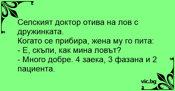 A falusi körzeti orvos elmegy vadászni a helyi társasággal. Hazaérve a felesége kérdezi tőle: - Nos kedvesem, hogy ment a vadászat? - Nagyon jól. Van 4 nyulam, 3 fácánom és 2 páciensem.