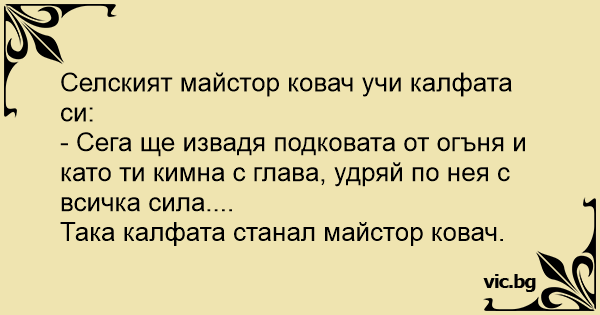 - Сега ще извадя подковата от огъня и като ти кимна с глава, удряй по нея с всичка сила....