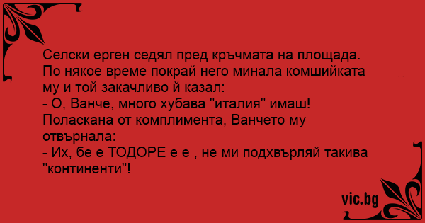 Селски ерген седял пред кръчмата на площада. По някое време покрай него минала комшийката му и той закачливо й казал: