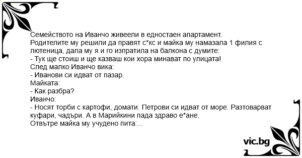 Родителите му решили да правят cekc и майка му намазала 1 филия с лютеница, дала му я и го изпратила на балкона с думите: