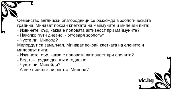 Семейство английски благородници се разхожда в зоологическата градина. Минават покрай клетката на маймуните и милейди пита: