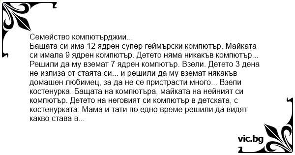 Бащата си има 12 ядрен супер геймърски компютър. Майката си имала 9 ядрен компютър. Детето няма никакъв компютър... Решили да му вземат 7 ядрен компютър. Взели. Детето 3 дена не излиза от стаята си... и решили да му вземат някакъв домашен любимец, за да не се пристрасти много... Взели костенурка. Бащата на компютъра, майката на нейният си компютър. Детето на неговият си компютър в детската, с костенурката. Мама и тати по едно време решили да видят какво става в детската. Гледат, костенурката се скрила в черупката си, а детето и бърка с отвертка в гъзa.