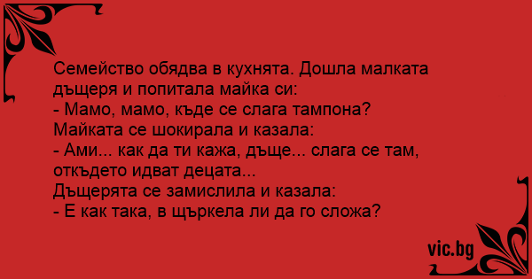 Семейство обядва в кухнята. Дошла малката дъщеря и попитала майка си: