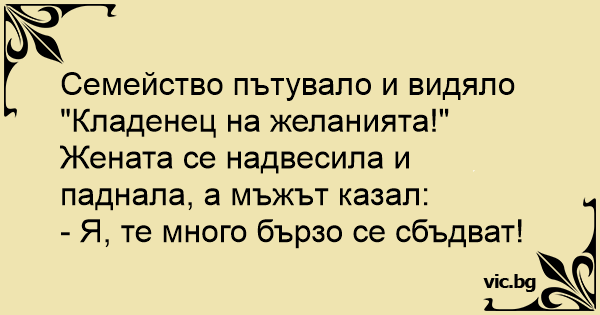 Pewien turysta wraz z żoną oglądają słynną studnię życzeń w Kornwalii. Oboje pogrążeni we własnych myślach. Po chwili żona wychyliła się, aby zajrzeć w głąb, straciła równowagę i wpadła do środka....