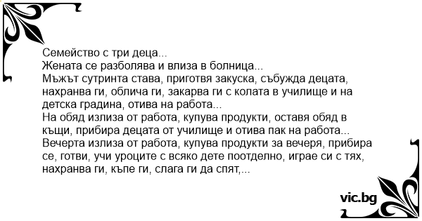 Мъжът сутринта става, приготвя закуска, събужда децата, нахранва ги, облича ги, закарва ги с колата в училище и на детска градина, отива на работа...