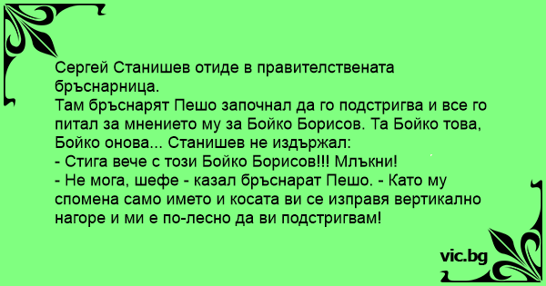 Там бръснарят Пешо започнал да го подстригва и все го питал за мнението му за Бойко Борисов. Та Бойко това, Бойко онова... Станишев не издържал: