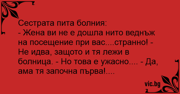 - Жена ви не е дошла нито веднъж на посещение при вас....странно! - Не идва, защото и тя лежи в болница. - Но това е ужасно.... - Да, ама тя започна първа!....