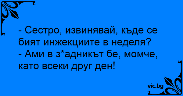 - Сестро, извинявай, къде се бият инжекциите в неделя? - Ами в з*адникът бе, момче, като всеки друг ден! English Deutsch Español Русский Français Italiano Ελληνικά Македонски Türkçe Українська Português Polski Svenska Nederlands Dansk Norsk Suomi Magyar Româna Čeština Lietuvių Latviešu Hrvatski
