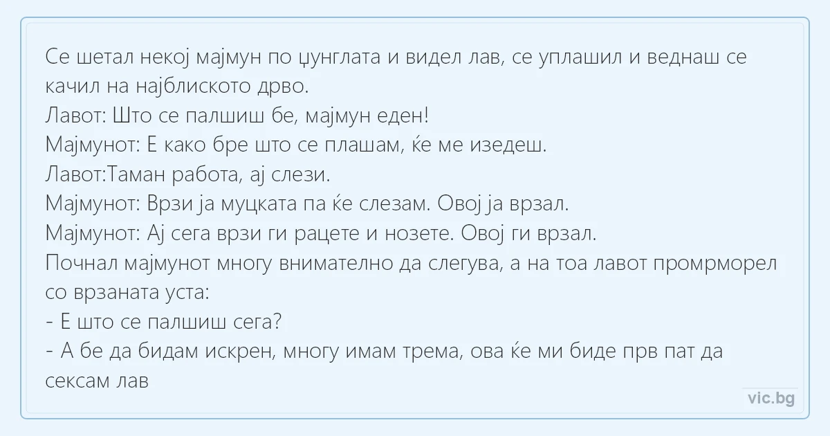 Се шетал некој мајмун по џунглата и видел лав, се уплашил и веднаш се качил на најблиското дрво. Лавот: Што се палшиш бе, мајмун еден! Мајмунот: Е како бре што се плашам, ќе ме изедеш. Лавот:Таман работа, ај слези. Мајмунот: Врзи ја муцката па ќе слезам. Овој ја врзал. Мајмунот: Ај сега врзи ги рацете и нозете. Овој ги врзал. Почнал мајмунот многу внимателно да слегува, а на тоа лавот промрморел со врзаната уста: - Е што се палшиш сега? - А бе да бидам искрен, многу имам трема, ова ќе ми биде прв пат да сексам лав