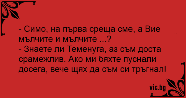- Знаете ли Теменуга, аз съм доста срамежлив. Ако ми бяхте пуснали досега, вече щях да съм си тръгнал!