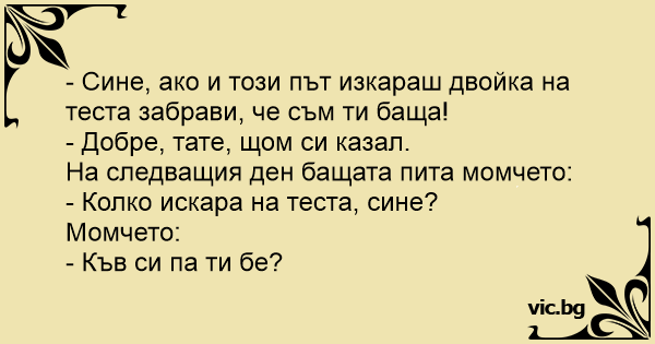Tatal ii Zice fiului: - Mai bine ai trece examenul azi, daca nu, Sa uiti ca sunt tatal tau! - Sigur, Tata... Dupa examen: - Deci, cum a fost Examenul? - Cine esti?