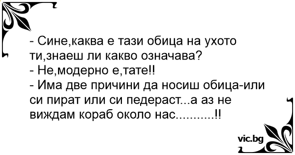 - Има две причини да носиш обица-или си пират или си пeдepact...а аз не виждам кораб около нас...........!!