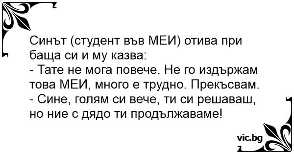 Синът (студент във МЕИ) отива при баща си и му казва: