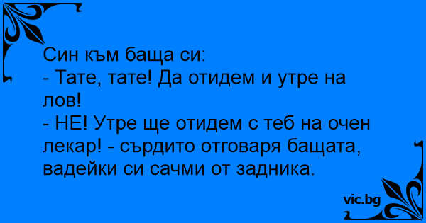 - НЕ! Утре ще отидем с теб на очен лекар! - сърдито отговаря бащата, вадейки си сачми от задника.