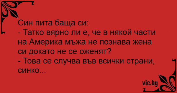 - Татко вярно ли е, че в някой части на Америка мъжа не познава жена си докато не се оженят?