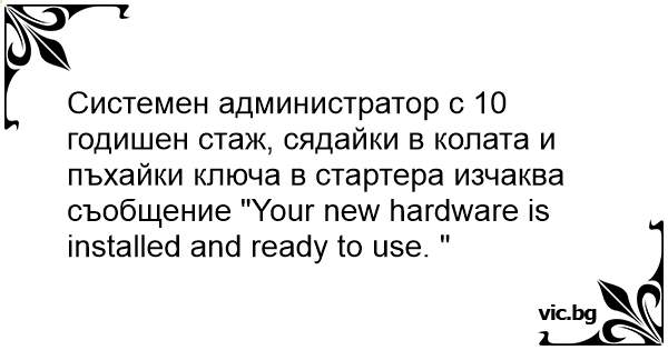 Системен администратор с 10 годишен стаж, сядайки в колата и пъхайки ключа в стартера изчаква съобщение "Your new hardware is installed and ready to use. "