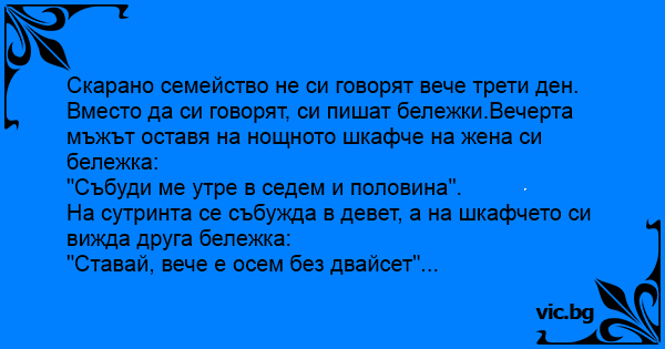 Скарано семейство не си говорят вече трети ден. Вместо да си говорят, си пишат бележки.Вечерта мъжът оставя на нощното шкафче на жена си бележка:
