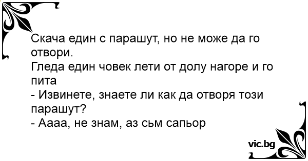 Jaunais izpletņlēcējs strauji tuvojas zemei. Pēkšņi skatās, pretī kāds lido. Izpletņlēcējs sauc: - Klau, vecīt, nezini kā rezerves izpletni atvērt? - Nezinu, es esmu sapieris.