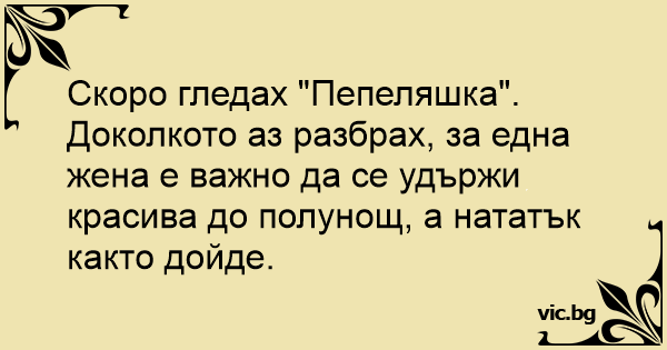 Скоро гледах "Пепеляшка". Доколкото аз разбрах, за една жена е важно да се удържи красива до полунощ, а нататък както дойде.