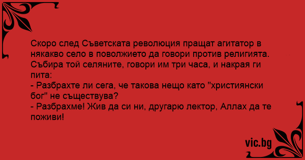 Скоро след Съветската революция пращат агитатор в някакво село в поволжието да говори против религията. Събира той селяните, говори им три часа, и накрая ги пита: - Разбрахте ли сега, че такова нещо като "християнски бог" не съществува? - Разбрахме! Жив да си ни, другарю лектор, Аллах да те поживи!