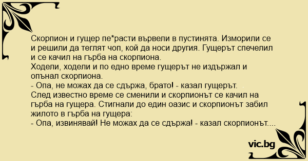 - Опа, извинявай! Не можах да се сдържа! - казал скорпионът.