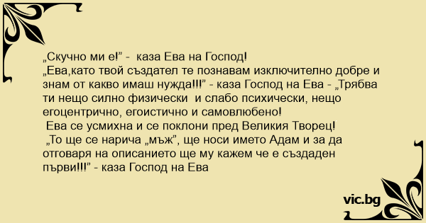 „Ева,като твой създател те познавам изключително добре и знам от какво имаш нужда!!!” - каза Господ на Ева - „Трябва ти нещо силно физически и слабо психически, нещо егоцентрично, егоистично и самовлюбено!