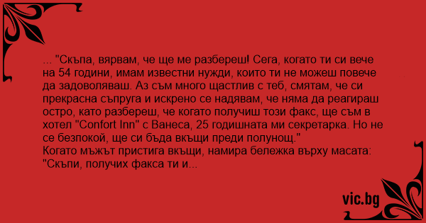 Когато мъжът пристига вкъщи, намира бележка върху масата: "Скъпи, получих факса ти и много ти благодаря за проявената загриженост. Възползвам се от случая да ти напомня, че ти също си на 54 години. И да те осведомя, че когато четеш тази бележка, ще съм в хотел "Fiesta" с Мишел, моя треньор по тенис, който, както и секретарката ти, е също на 25 години. Понеже, освен че си преуспял бизнесмен, си завършил още и математика, ще можеш лесно да разбереш, че си приличаме при тези обстоятелства, но ... с една малка разлика: "25 влиза повече пъти в 54, отколкото 54 в 25 ...". Следователно, не ме очаквай по-рано от утре ....