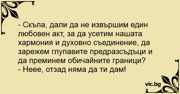 - Скъпа, дали да не извършим един любовен акт, за да усетим нашата хармония и духовно съединение, да зарежем глупавите предразсъдъци и да преминем обичайните граници?