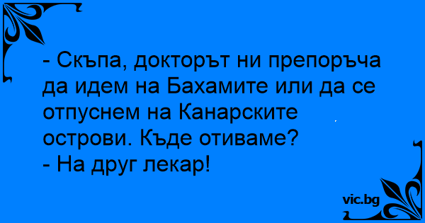 - Скъпа, докторът ни препоръча да идем на Бахамите или да се отпуснем на Канарските острови. Къде отиваме?