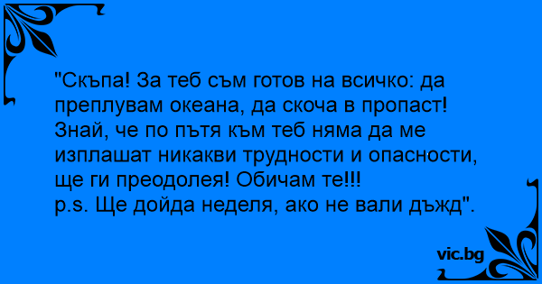 "Скъпа! За теб съм готов на всичко: да преплувам океана, да скоча в пропаст! Знай, че по пътя към теб няма да ме изплашат никакви трудности и опасности, ще ги преодолея! Обичам те!!!