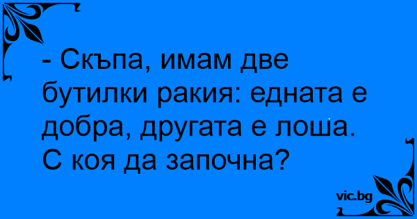 - Скъпа, имам две бутилки ракия: едната е добра, другата е лоша. С коя да започна?