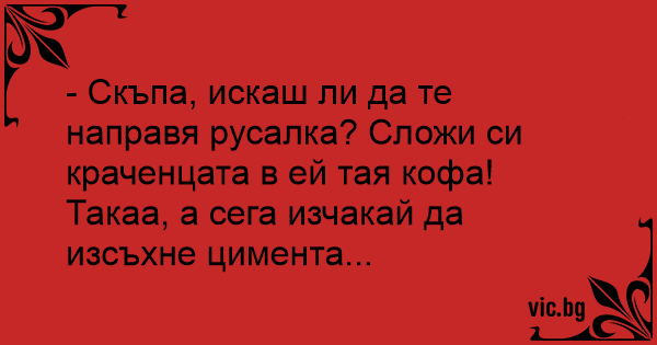 - Скъпа, искаш ли да те направя русалка? Сложи си краченцата в ей тая кофа! Такаа, а сега изчакай да изсъхне цимента...