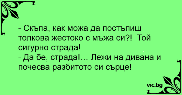- Да бе, страда!… Лежи на дивана и почесва разбитото си сърце!