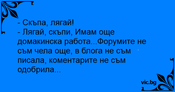 - Лягай, скъпи, Имам още домакинска работа...Форумите не съм чела още, в блога не съм писала, коментарите не съм одобрила...