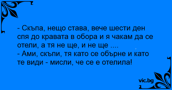 - Скъпа, нещо става, вече шести ден спя до кравата в обора и я чакам да се отели, а тя не ще, и не ще ....