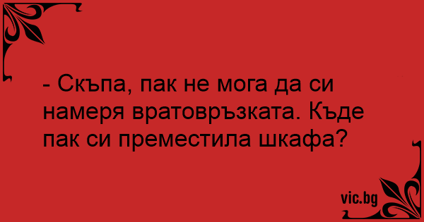 - Скъпа, пак не мога да си намеря вратовръзката. Къде пак си преместила шкафа?